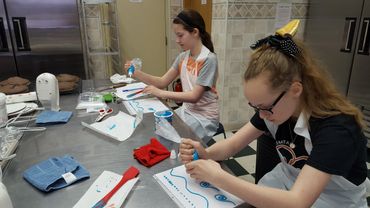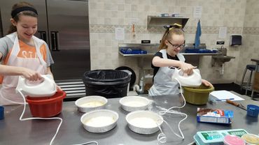 Kids start with a chef hat project. Then they will enter the kitchen dressed as "chef's" to roll out their own dough & top individual pizzas.